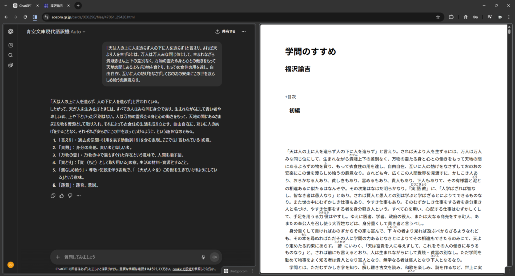 個人的には、Chromeの画面分割(タブを並べて表示)を使い、1画面にChatGPTと青空文庫を並べて読むのがおすすめです。